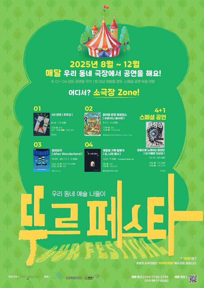 힐링의 무대 '뚜르페스타' 춘천 후평동 소재의 극단 Art3-Theatre(대표 김경태) '소극장존'에서 8월 15일(금)부터 12월 20 일(토)까지 우리 동네 예술나들이 '뚜르페스타'가 열린다.