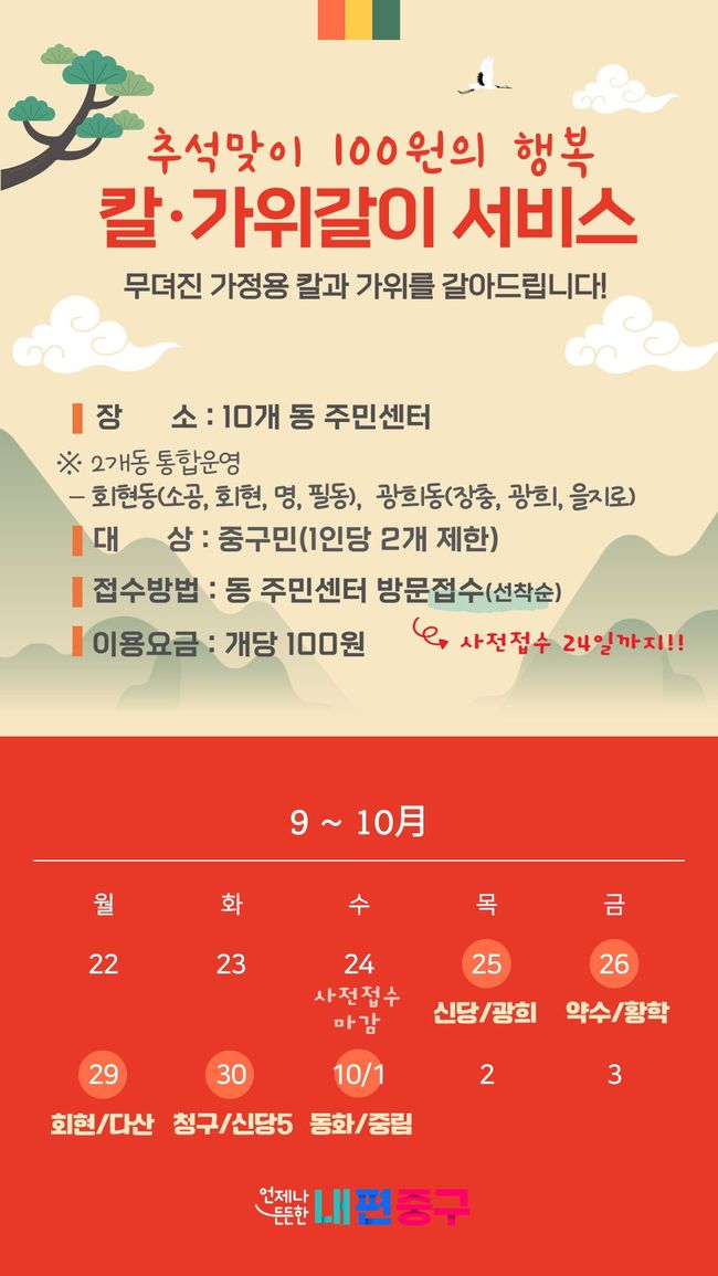 서울 중구가 추석 명절을 앞두고 9월 25일부터 10월 1일까지 ‘찾아가는 칼·가위갈이 서비스’를 운영한다.