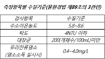 • 유리잔류염소: 0.4 ~ 4.0mg/L (염소소독을 하는 경우에만 해당)