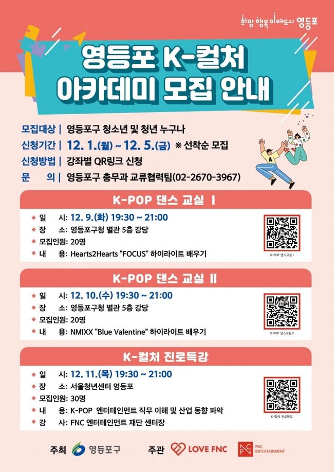 영등포 K-컬처 아카데미 모집 안내 포스터.영등포구(구청장 최호권)는 2일 글로벌 K-컬처에 관심 있는 청소년과 청년을 대상으로 ‘댄스교실’과 ‘진로특강’으로 구성된 ‘영등포 K-컬처 아카데미’를 운영하고 참가자를 모집한다고 밝혔다.