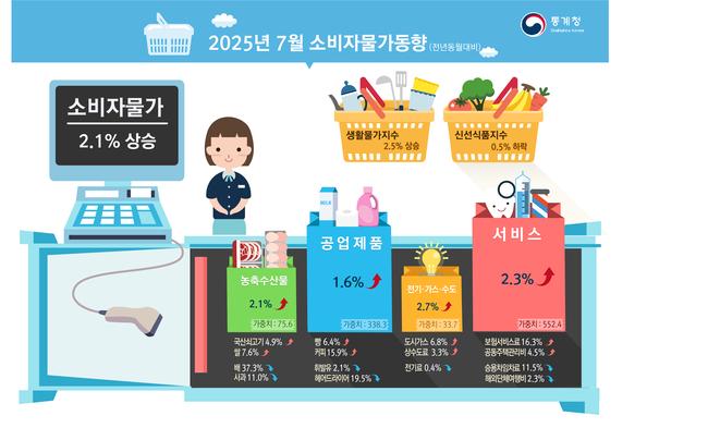 통계청이 발표한 `2025년 7월 소비자물가동향`에 따르면, 7월 소비자물가지수는 전월 대비 0.2%, 전년 동월 대비 2.1% 각각 상승했다. 이는 전기·가스·수도 가격은 하락했지만, 서비스, 농축수산물, 공업제품 가격이 오르면서 전체 지수를 끌어올린 결과다.