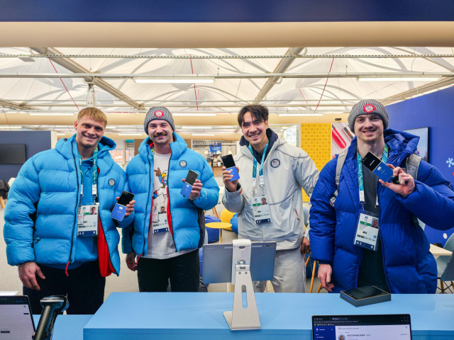 미국 봅슬레이팀 선수들이 코르티나 올림픽 선수촌 내 삼성 체험관을 방문해 갤럭시 Z 플립7 올림픽 에디션을 보여주고 있다